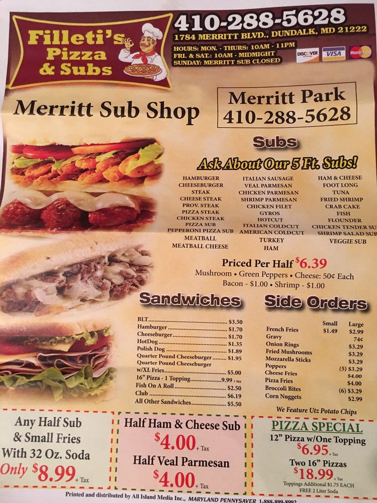 Welcome to Merritt Sub, a delightful stop for Italian enthusiasts craving authentic pizza. Conveniently located at 1784 Merritt Blvd, Dundalk, MD, Merritt Sub offers a menu that speaks to both tradition and taste. With a commitment to quality ingredients, each pizza is crafted with care, featuring a variety of delectable toppings that cater to every palate.